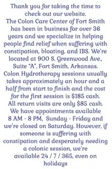 Welcome to our gallery page! Here you can see some examples of the services we offer for you in Fort Smith, AR. If you like what you see, give us a call at (479) 226-7151. We offer some of the best colonic hydrotherapy services in the area.